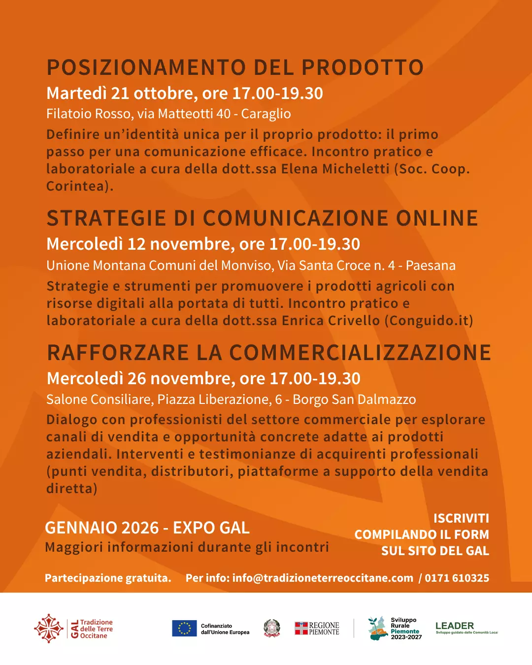 è nostro piacere informarvi che il GAL Tradizione delle Terre Occitane, nell’ambito delle attività di accompagnamento su biodiversità e filiere, prosegue il percorso dedicato alle aziende agricole dell’area GAL, con l’obiettivo di rafforzare le competenze nella promozione, comunicazione e commercializzazione dei prodotti locali.